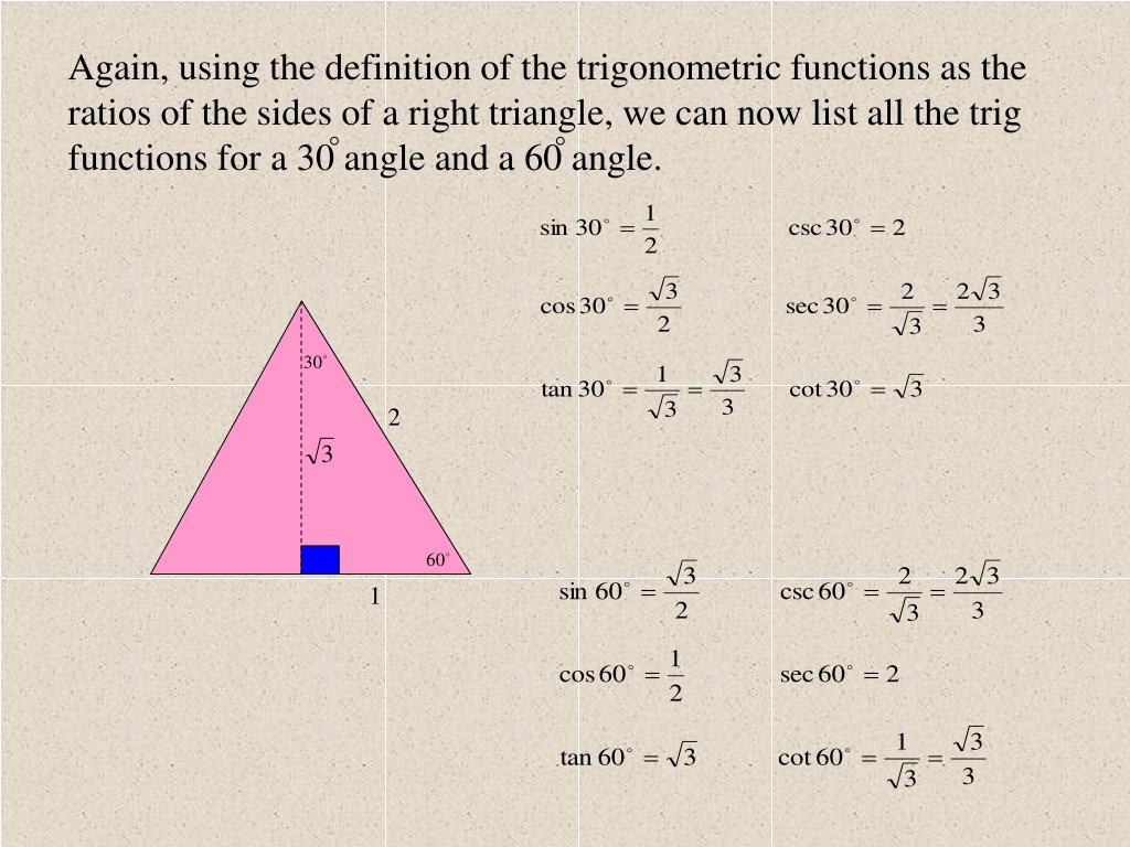 Since csc x 1 sin x first find the value of the sin 60. For every trigonometry function such as csc there is an inverse function that works in reverse. In the reference triangle with 60 centered at origin against the positive x axis the side opposite 60 is s sqrt 3 the side opposite 30 is s and the hypotenuse is 2s. Interior of the reference triangle with 60 dependent at commencing position against the advantageous x axis the part opposite 60 is s sqrt 3 the part opposite 30 is s and the hypotenuse is 2s.